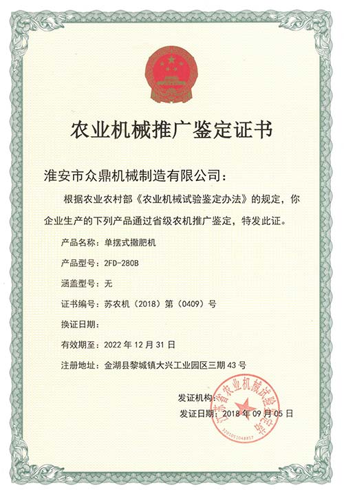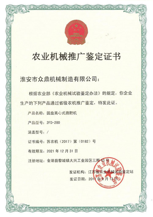 農(nóng)業(yè)機(jī)械推廣鑒定證書(shū)2FD-280