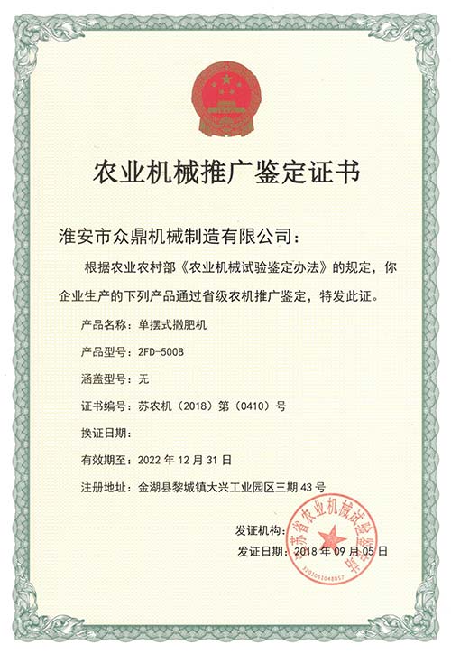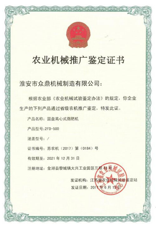 農(nóng)業(yè)機(jī)械推廣鑒定證書(shū)2FD-500