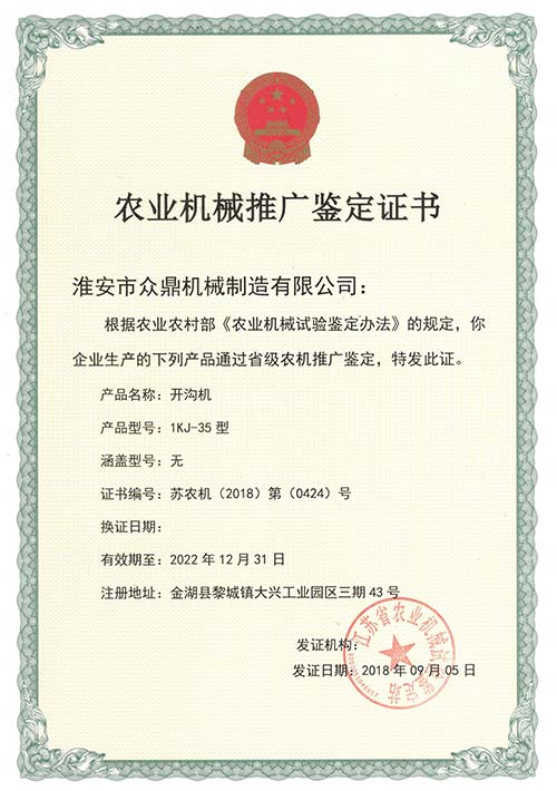 農(nóng)業(yè)機(jī)械推廣鑒定證書(shū)1KJ-35型
