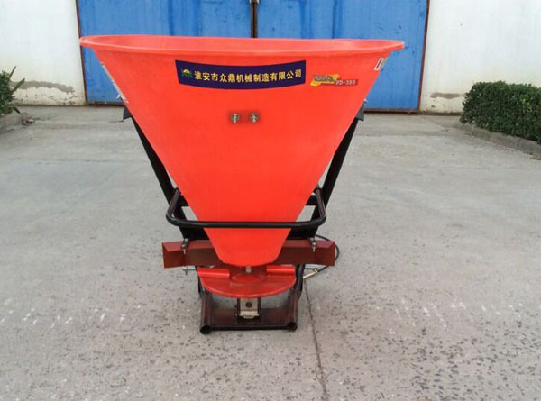 顆粒狀或球狀化肥經(jīng)人工倒入,進入機具的肥料斗箱,通過手動肥料調(diào)節(jié)控制桿,肥料落入撒肥盤,撒肥盤做旋轉(zhuǎn)運動,通過旋轉(zhuǎn)離心力將肥料以圓周狀形式拋至土壤表面。